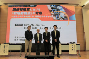 左から購買ネットワーク会 代表 梅原氏、積水化学工業株式会社 高機能プラスチックスカンパニー 中間膜事業部 担当部長 高原氏、未来調達研究所 坂口氏、SB C&S株式会社ICT事業本部 パーチェスワン事業統括部 三松